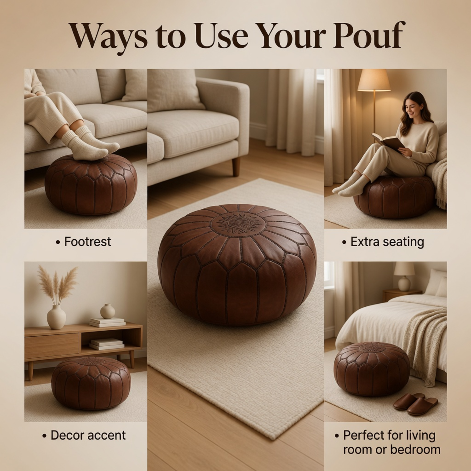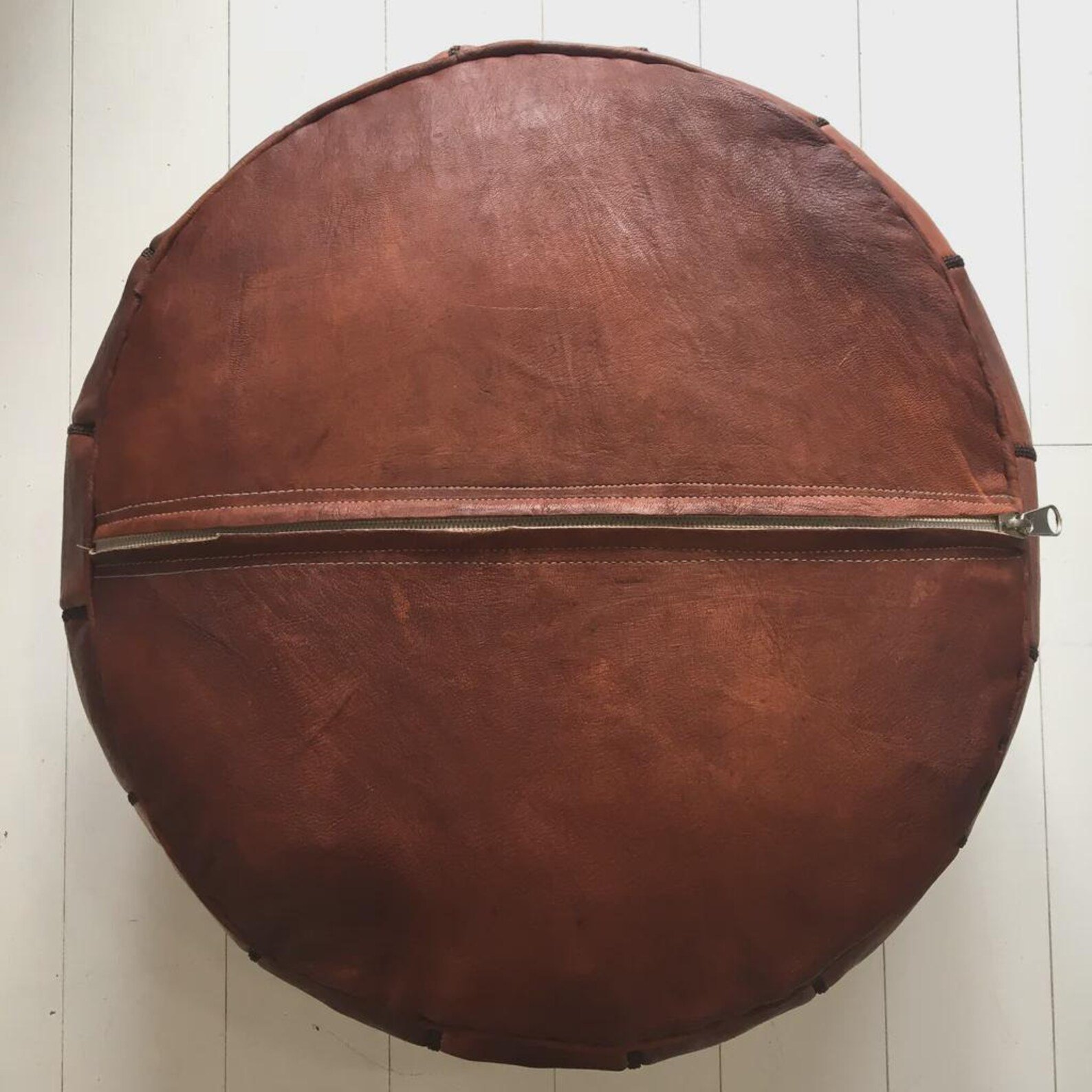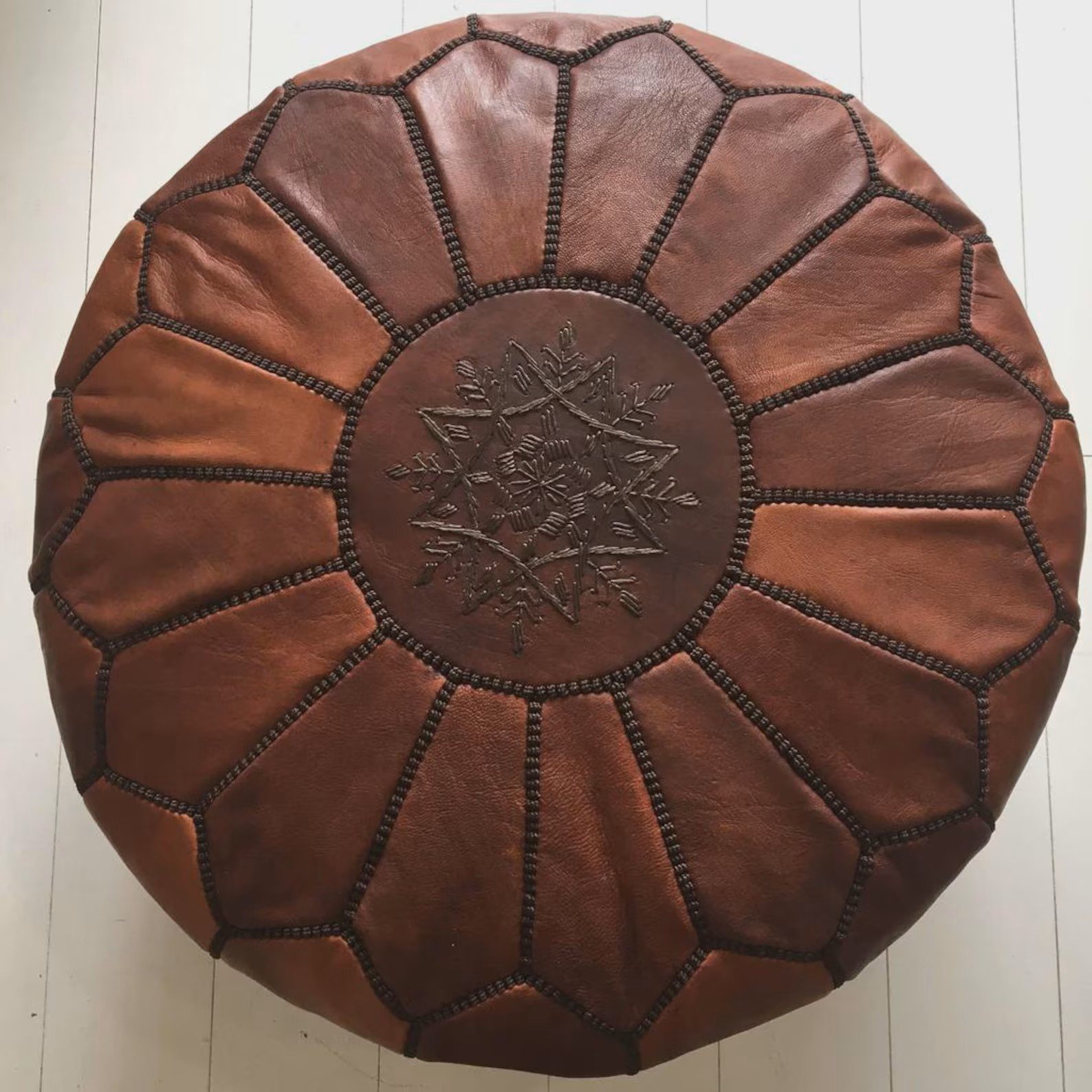 Each pouf is carefully handmade by Moroccan artisans, making every piece unique in character and finish. Its rich brown color and timeless design blend beautifully with boho, modern, rustic, and classic interiors.