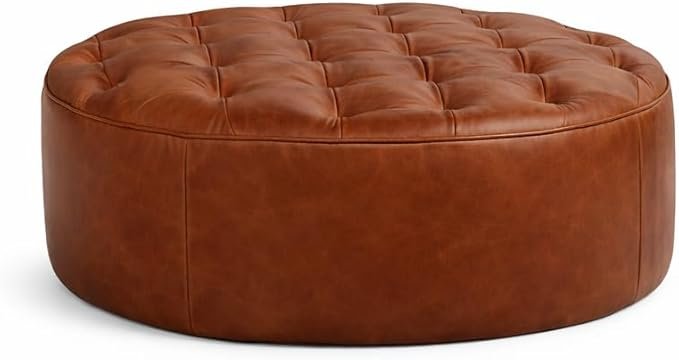 Bring warmth and elegance to your home with this handcrafted brown leather pouf ottoman. Its round tufted design adds a timeless touch while offering extra seating, comfort, and style to any living room, bedroom, or cozy corner. Perfect as a footrest, accent piece, or decorative ottoman.